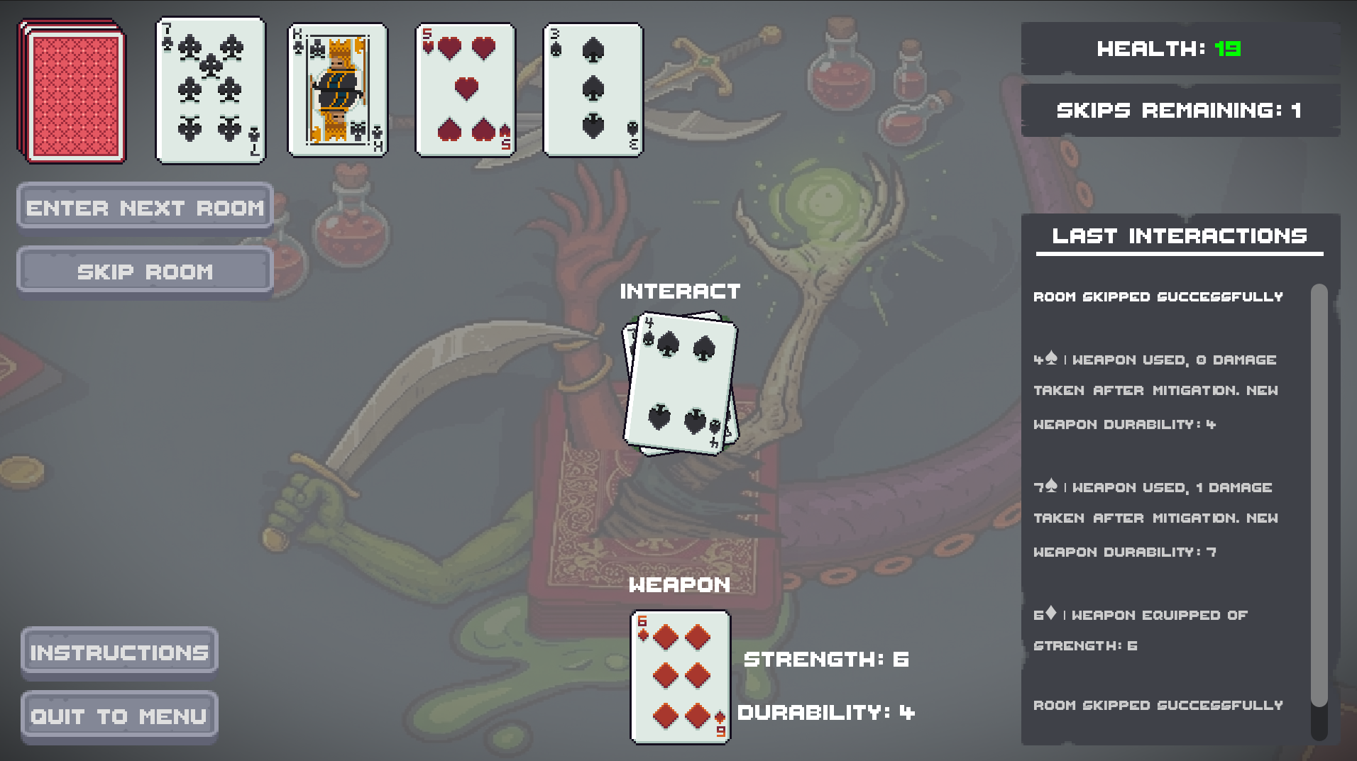 Scoundrel is a single-player dungeon crawler where the adventurer (you!) attempts to make it through the dungeon (the deck) by progressing through rooms of 4 cards, which can be monsters, weapons, or health potions. Only the most strategic adventurer will make it out of the dungeon alive!